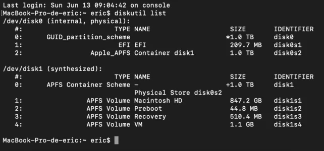 2. Dans toute mon affolement j'ai oublié de préciser que j'ai installé OS Big Sur sur un DD externe, sur lequel je suis actuellement.Pour voir ce qu'il est possible de faire --> passe la commande :